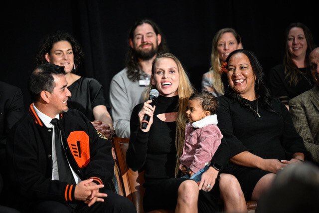 Former Beaver All-America basketball player Jamie Weisner Scott, with daughter in her lap, speaks during Hall of Fame ceremony (courtesy Karl Maasdam/OSU Sports Communications)