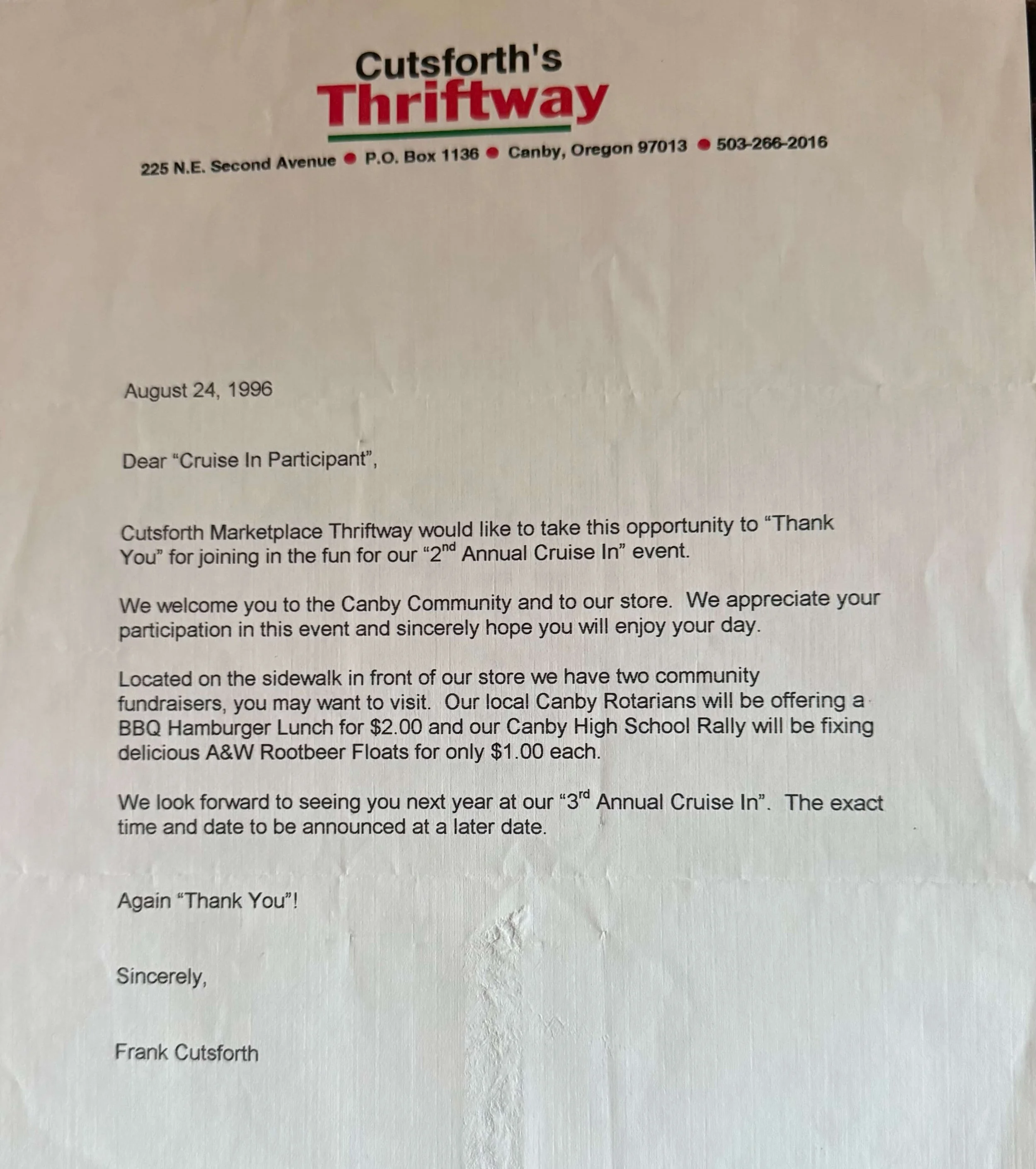 A note from Frank Cutsforth to participants of the second Cutsforth’s Cruise In in 1996 (courtesy Connie Austen)