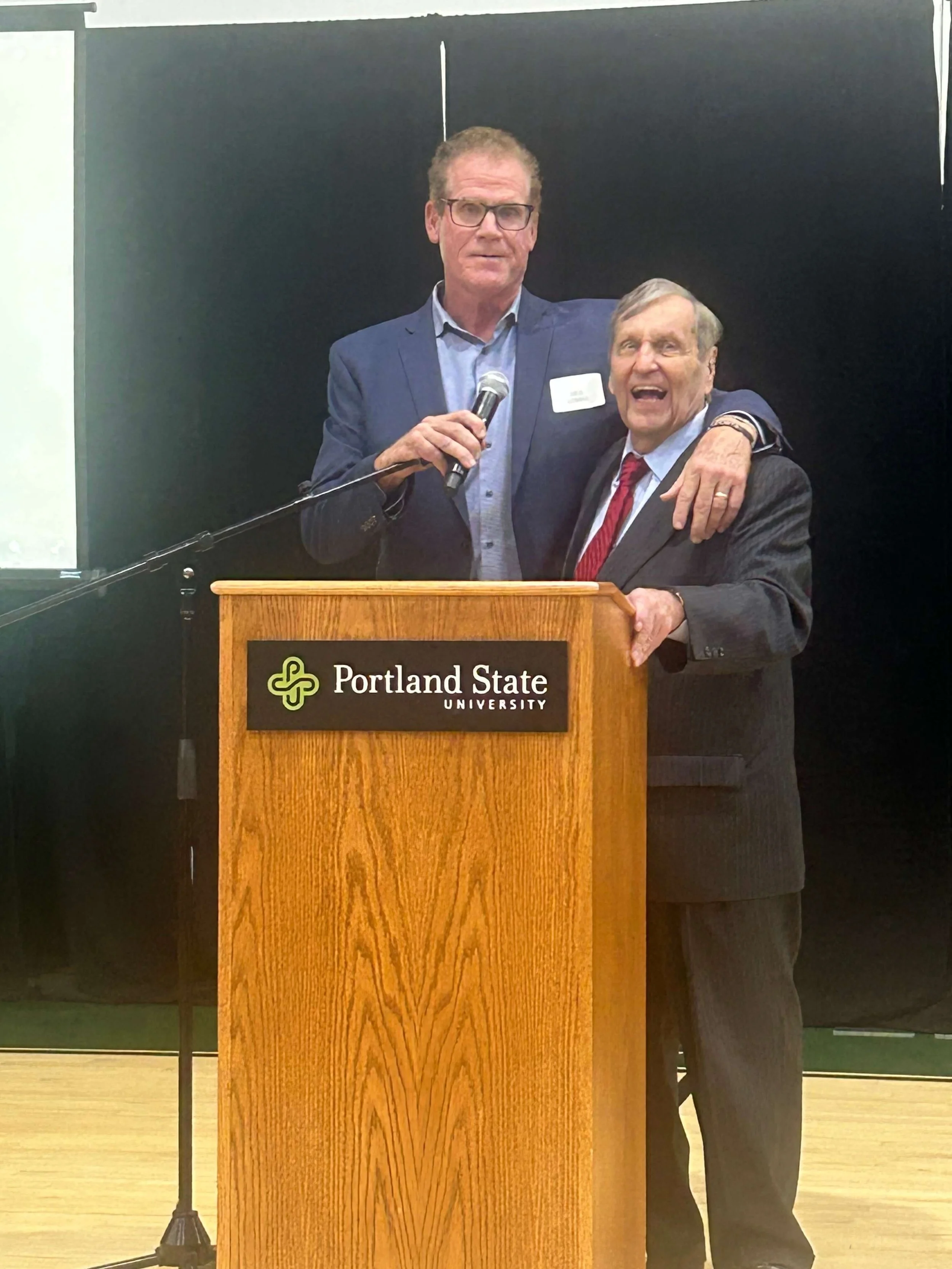 Mouse Davis (right) and son Brad laugh it up during Mouse’s big night at the Portland State Pavilion (courtesy Jack Lewy)
