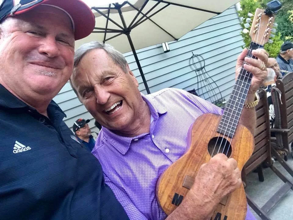Davis, playing Rick Schonely’s ukulele during an Eggs’ Scramble golf tournament (courtesy Rick Schonely)